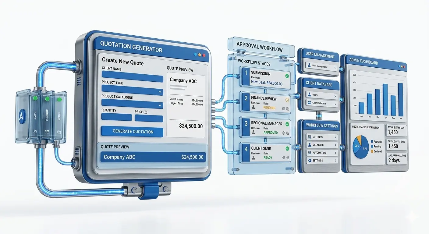 Quotation and proposal generators, approval workflow systems, inventory management tools, internal reporting dashboards, staff scheduling systems, document automation, and any custom operational tool your process requires