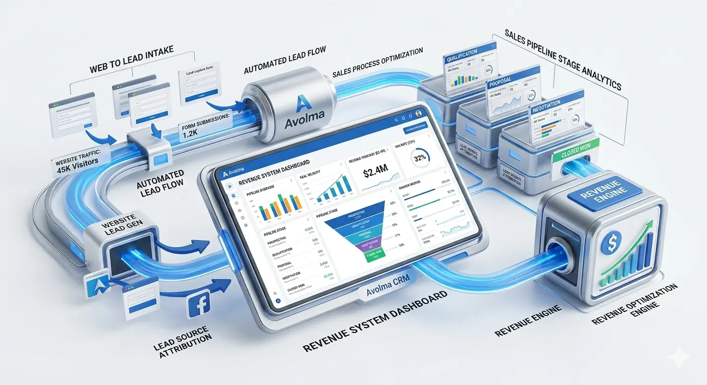 Website to CRM integration, form-to-pipeline automation, lead notification to team, and full analytics setup. One seamless revenue flow.