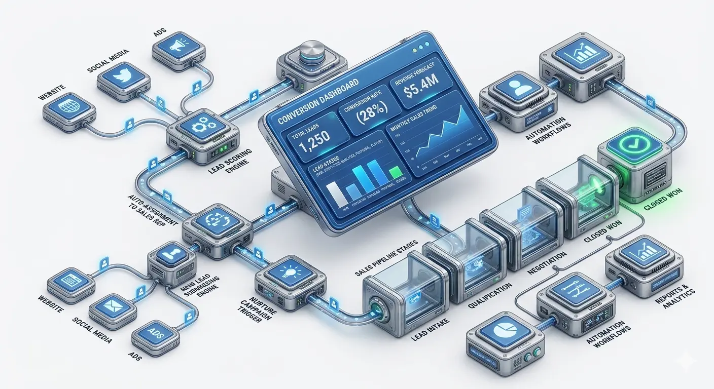A website without CRM integration is just a brochure. A CRM without a website feeding it is just a contact list. We engineer both together – so every visitor who lands on your site moves into a structured, automated pipeline without a single manual action from your team.